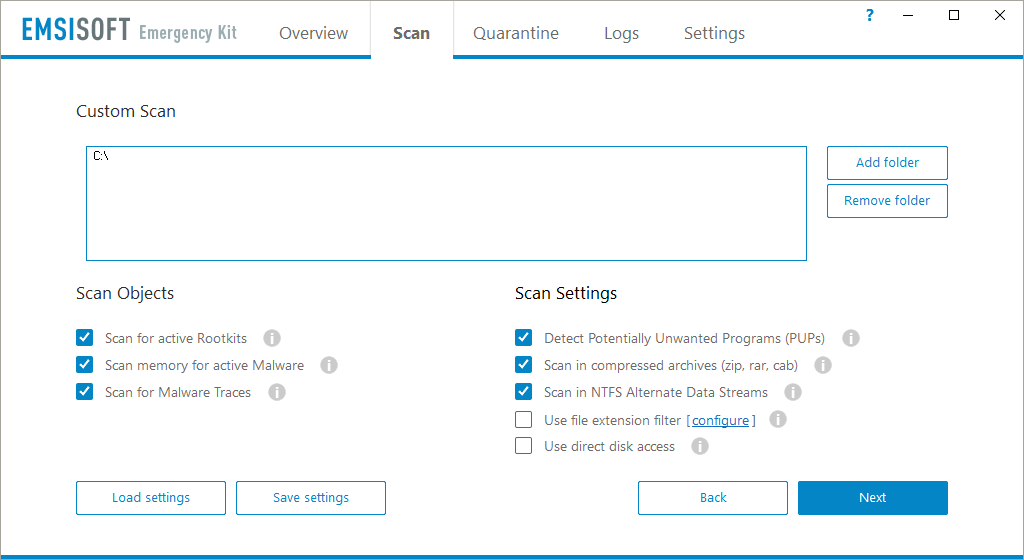If you wish to repeat a Custom Scan in the future, you can save the configuration to a scan settings file via the Save settings. button and load it at any time via the Load settings button.